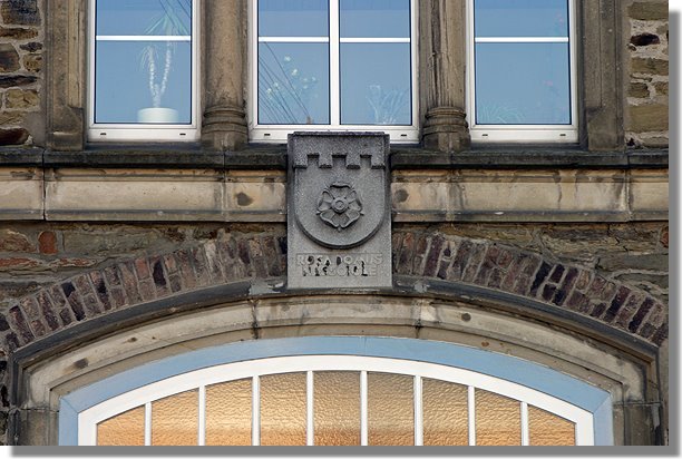 Das Wappen in Sandstein am Rathaus von Miehlen von Hermann Kornmesser erstellt.